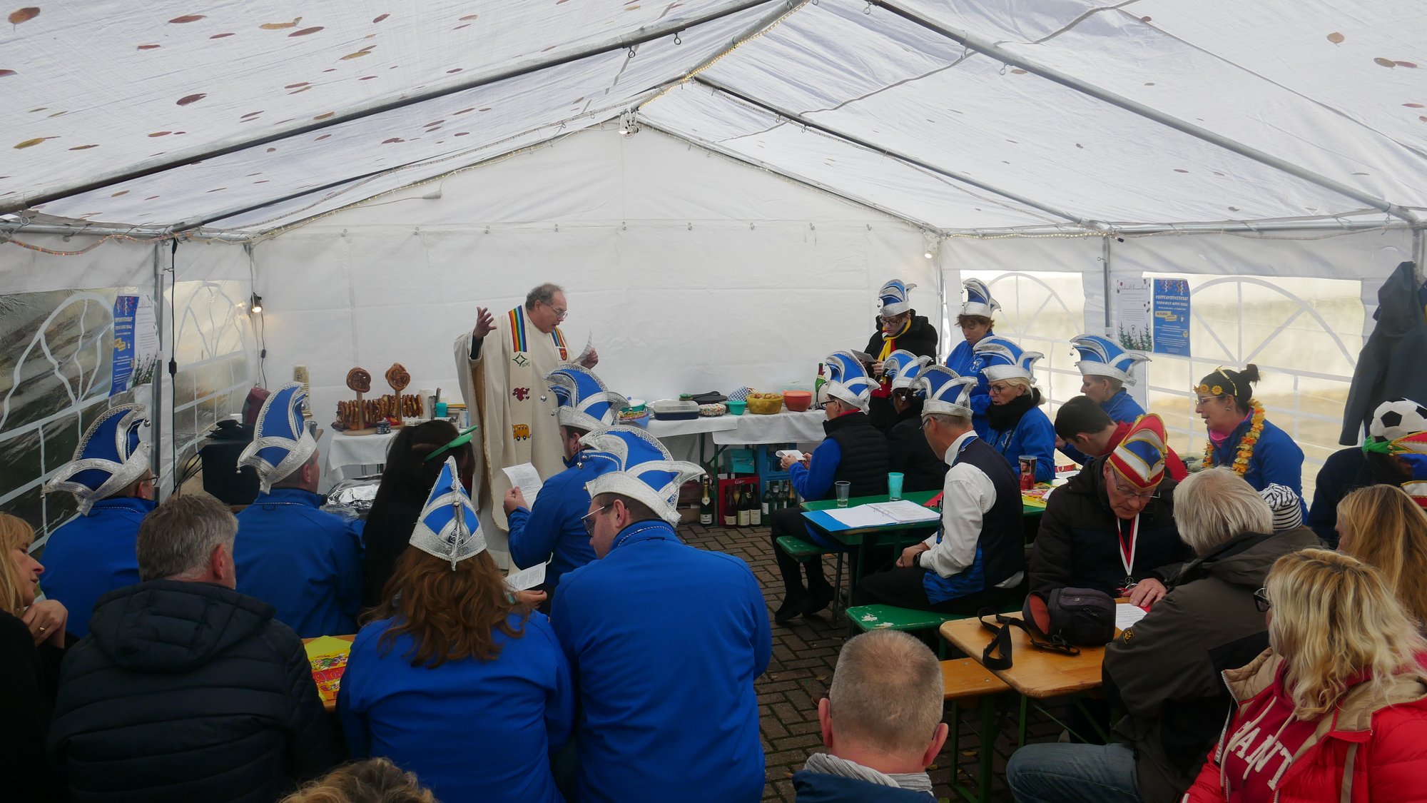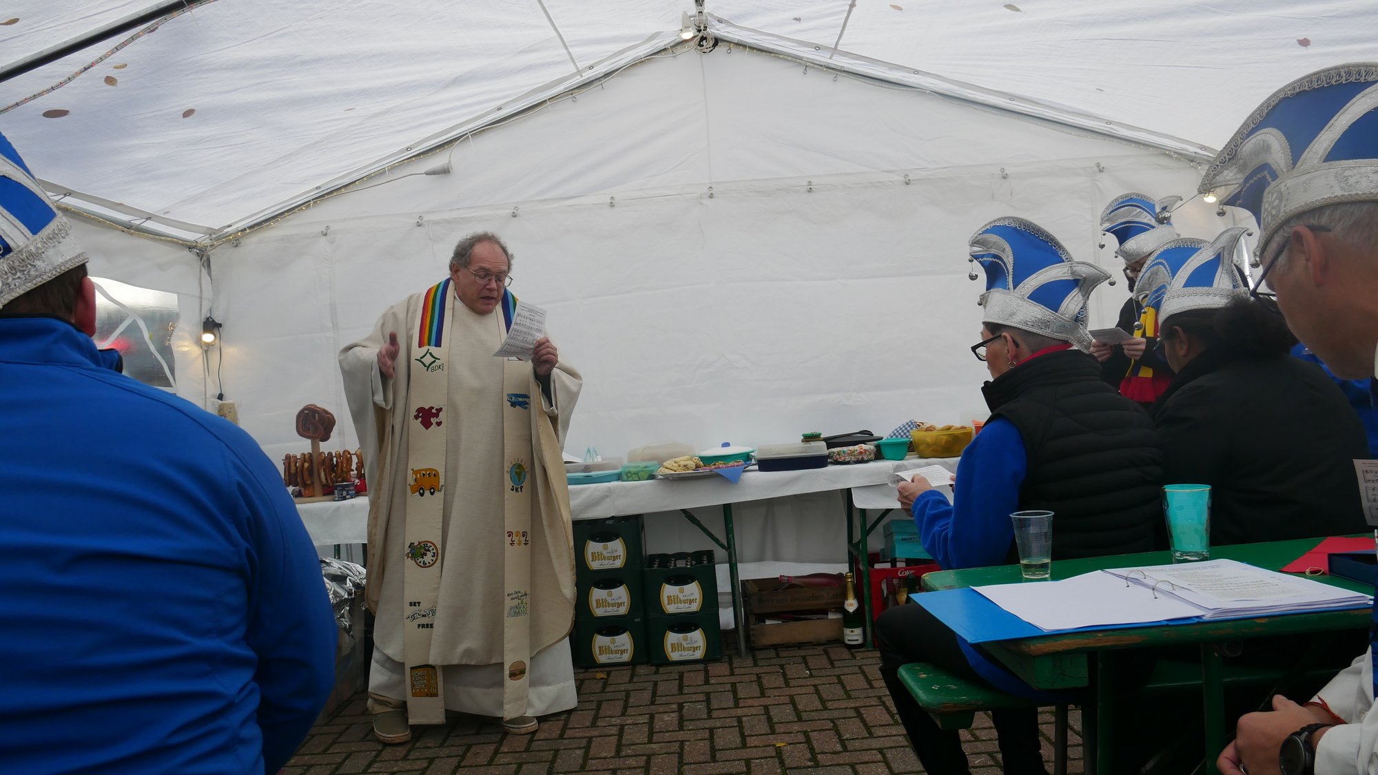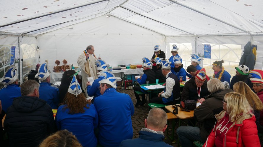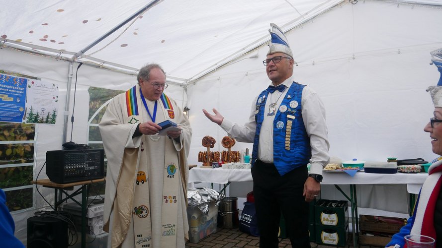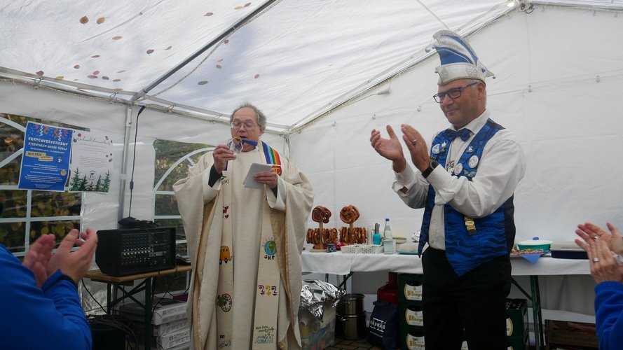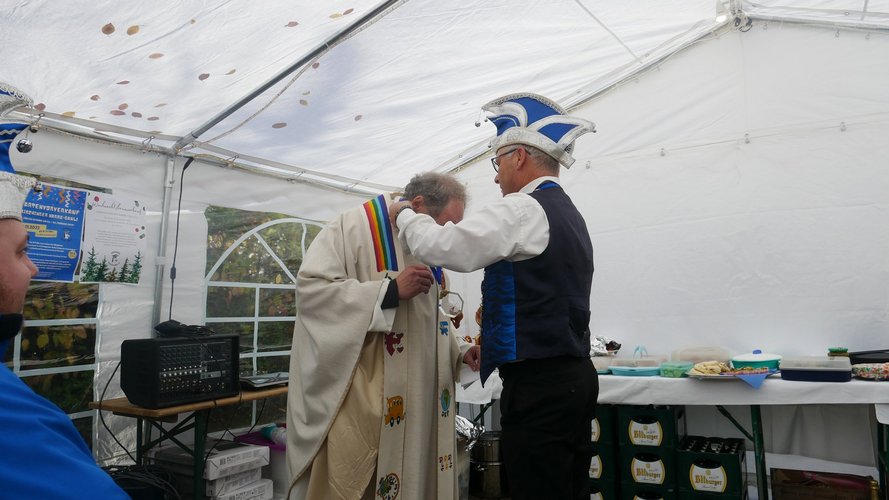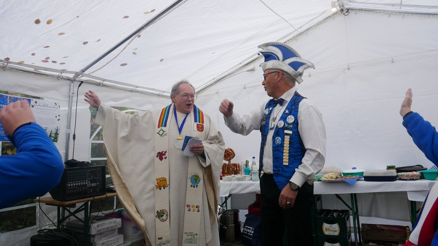 Herr Metzinger bedauerte, dass sein Mitbruder von der protestantischen Gemeinde, Peter Rummer wegen einer Versammlung nicht dabei sein konnte. Er verlas von ihm ein närrisches Grußwort. Mit einem Friedensgebet und dem Vater Unser drückten die Anwesenden aus, wie wichtig der Frieden um Himmels willen für das Zusammenleben ist. Mit dem Segen Gottes wurde all das gebetete und gehörte in die Herzen und Hände der Gottesdienstbesucher:innen gelegt. Zum Abschluss erschallte das „Oh when the saints, go marching in“ durch das Festzelt und auf die Straße nebenan. Pfarrer Metzinger hatte Begeisterung für das Wort Gottes entfacht, es gab freudige Gesichter und es schien, als schwebte der „gute Geist“ durch und über den Sitzreihen und die beginnende Fastnachtskampagne.
