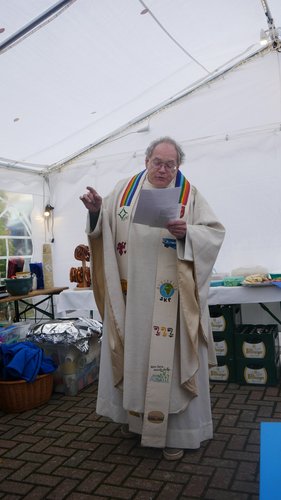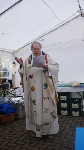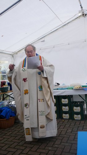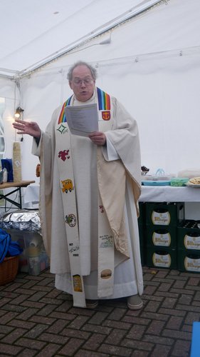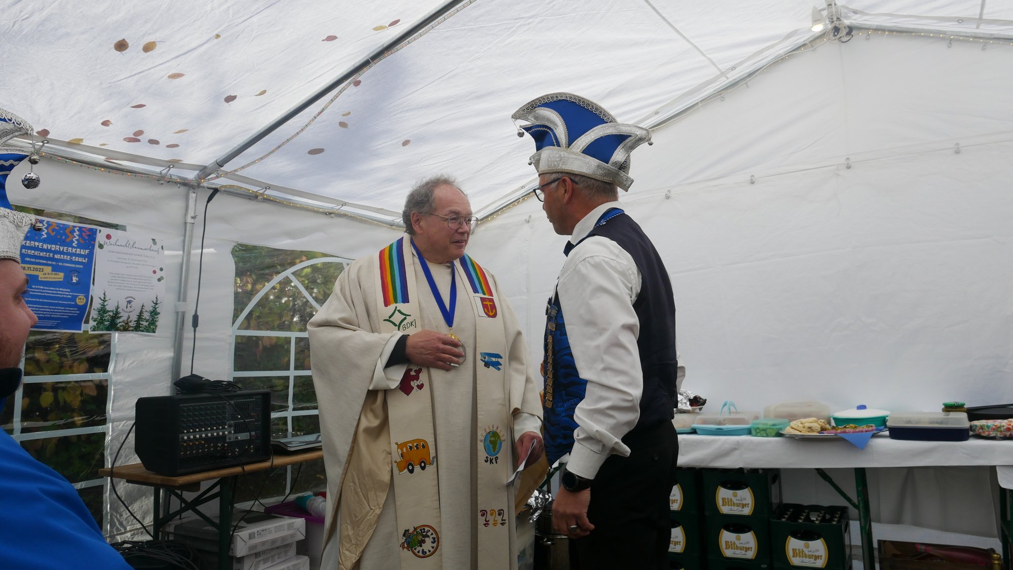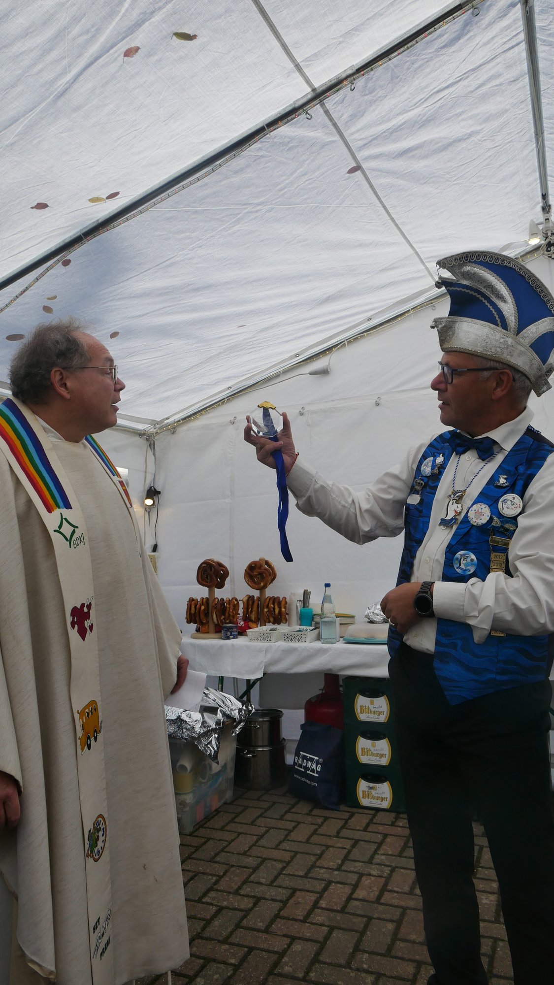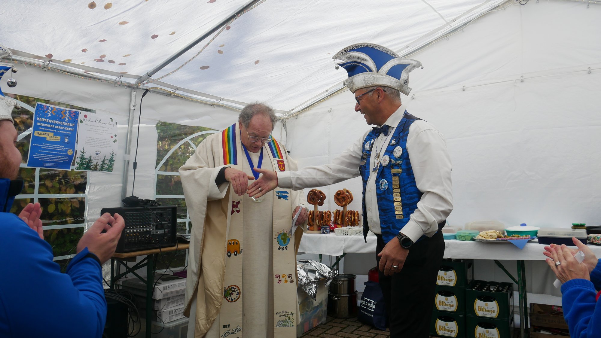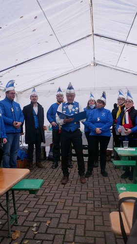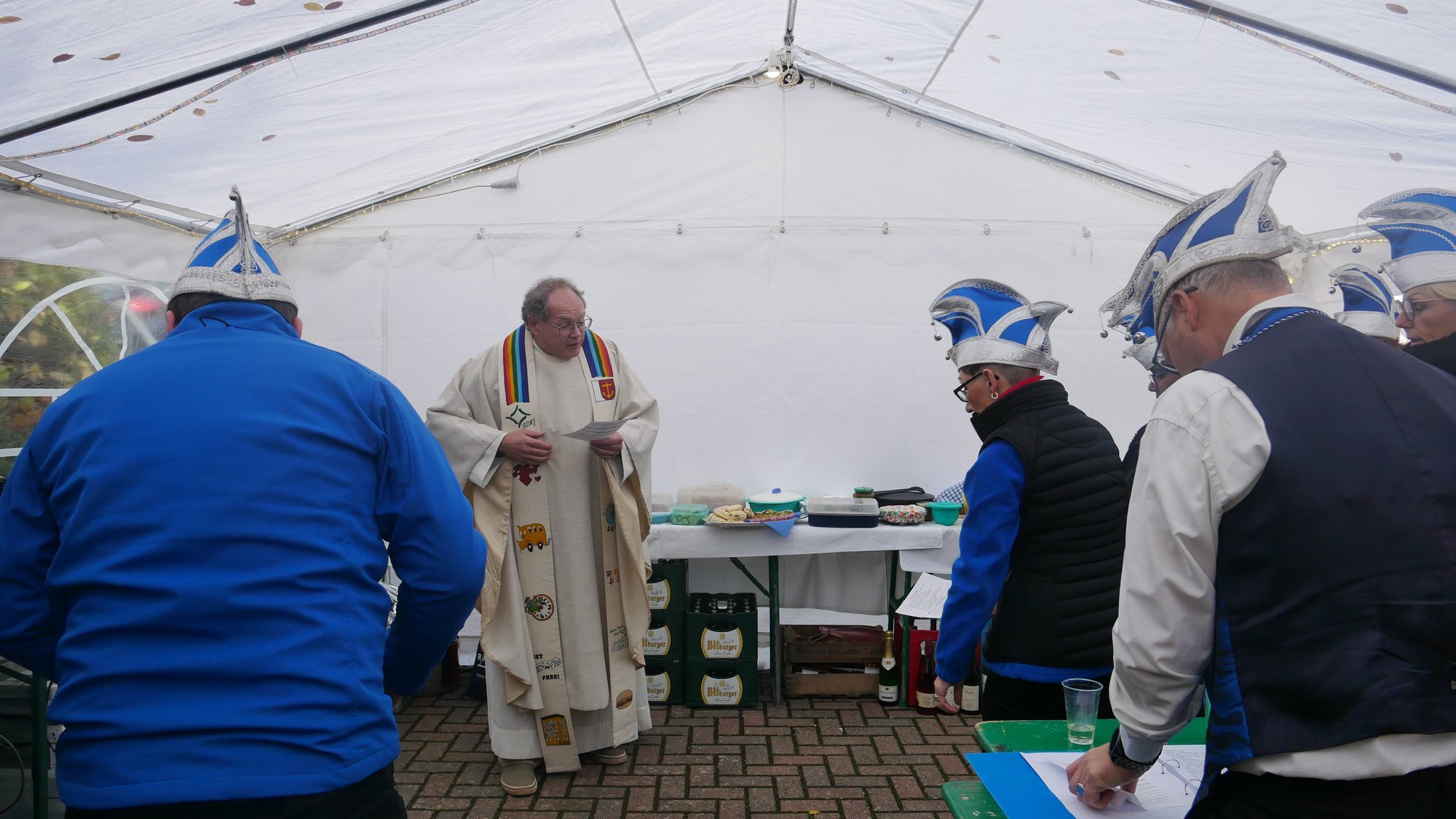 Herr Metzinger bedauerte, dass sein Mitbruder von der protestantischen Gemeinde, Peter Rummer wegen einer Versammlung nicht dabei sein konnte. Er verlas von ihm ein närrisches Grußwort. Mit einem Friedensgebet und dem Vater Unser drückten die Anwesenden aus, wie wichtig der Frieden um Himmels willen für das Zusammenleben ist. Mit dem Segen Gottes wurde all das gebetete und gehörte in die Herzen und Hände der Gottesdienstbesucher:innen gelegt. Zum Abschluss erschallte das „Oh when the saints, go marching in“ durch das Festzelt und auf die Straße nebenan. Pfarrer Metzinger hatte Begeisterung für das Wort Gottes entfacht, es gab freudige Gesichter und es schien, als schwebte der „gute Geist“ durch und über den Sitzreihen und die beginnende Fastnachtskampagne.