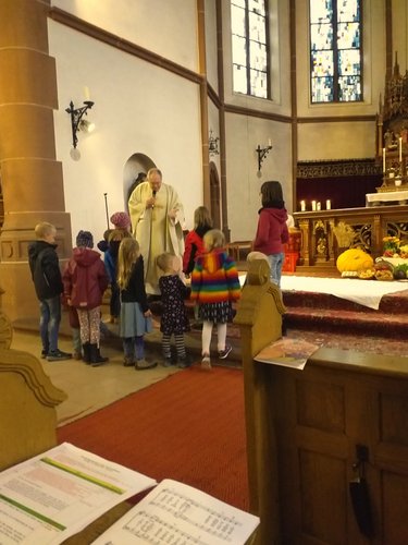 Im Gottesdienst hatten wir neben dem ernsten Thema der Dankbarkeit, aber auch viel Spaß. Die Kinder durften das „tägliche Brot“ in Form von in Scheiben geschnittenen unterschiedlichen Brötchen [Vollkorn, Weizen, Mehrkorn, Lauge, etc.] kosten und erfahren, dass diese Vielfalt noch vor einem halben Jahrhundert nicht denkbar war, heute aber zeigt, dass es uns gut geht. Die Kinder waren eingeladen während des längeren Gottesdienstes gerne nach vorne zu kommen und sich an den Brötchen zu bedienen, was sie auch gerne gemacht haben.
