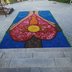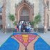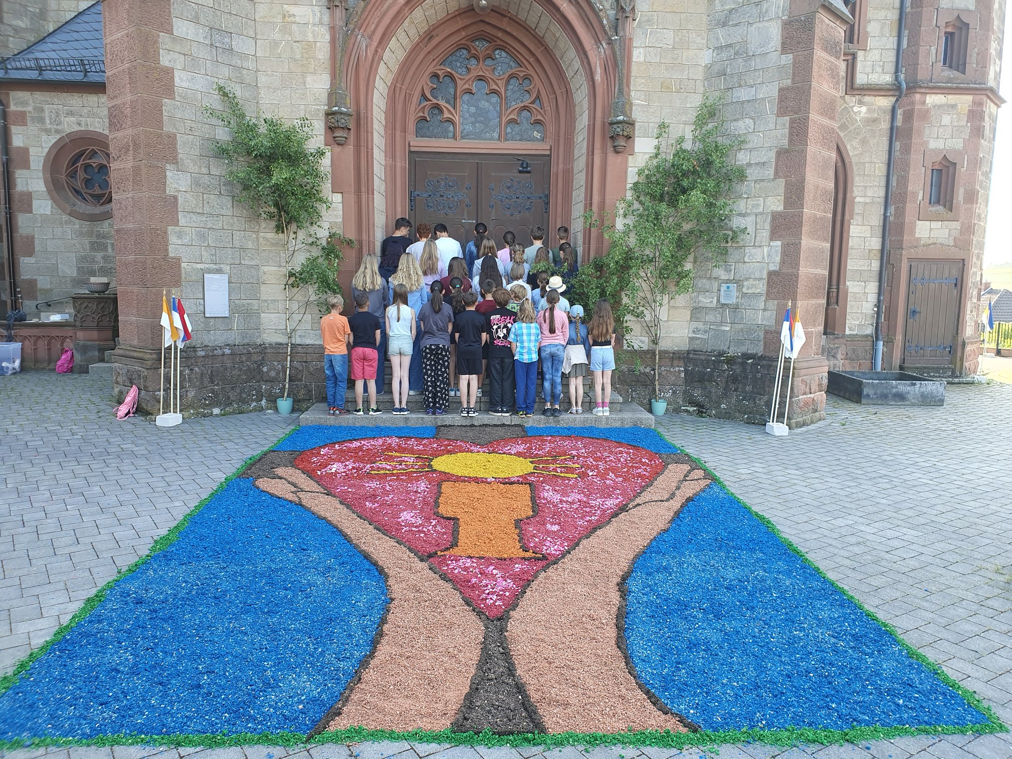 Inhaltlich umrahmt wurde das Fronleichnamsfest durch den großen Fronleichnamsteppich, den unsere Messdiener*innen in einem kleinen Wettbewerb selber entwarfen und an Fronleichnam frühmorgens legten. In dem Entwurf sollte wiedergegeben werden, was wir in der Gruppenstunde über Fronleichnam sagten. Herausgekommen ist ein tolles Bild, das mehrere Deutungen zulässt, die wir in der Predigt erörterten. Es ist alles drin, was unseren Glauben ausmacht: der Himmel als Sehnsucht, die aber am Kreuz vorbei muss. Das Kreuz ist aus dem Leben nicht wegzudiskutieren, aber hinter der großen Liebe zwischen Gott und Mensch, immer wieder gestärkt aus Leib und Blut Christi, hat das Kreuz des Leidens nichts zu sagen und wird zum Ort der Erlösung, mit welcher wir einander behutsam und zärtlich gegenseitig - Gott und Mensch - unser Herz halten und behüten. Damit erfahren wir Halt und Stärke, Frieden und Zuversicht in einer immer schwieriger werdenden Welt.