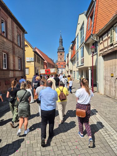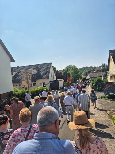 Mit einem neuen Weg, der im Vergleich zu dem bisherigen Fronleichnamsweg in Göllheim kürzer war und sich innerhalb der Altstadt entlang zog, kam das Vorbereitungsteam scheinbar allen Schwestern und Brüder entgegen, denn im Nachklang lobten sehr viele den neuen Prozessionsverlauf – sowohl von der Länge, als auch von der Auswahl der Altarorte her.