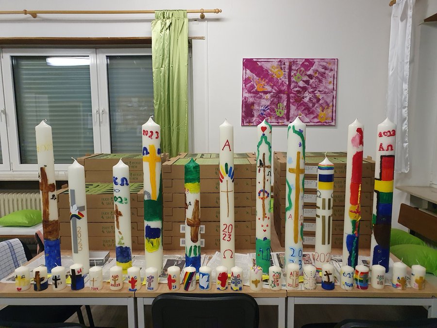 Am Montag der Karwoche trafen sich rund 30 Kinder- und Jugendliche und gestalteten die 11 Osterkerzen unserer 10 Kirchen und dem Betsaal-Dreisen.
