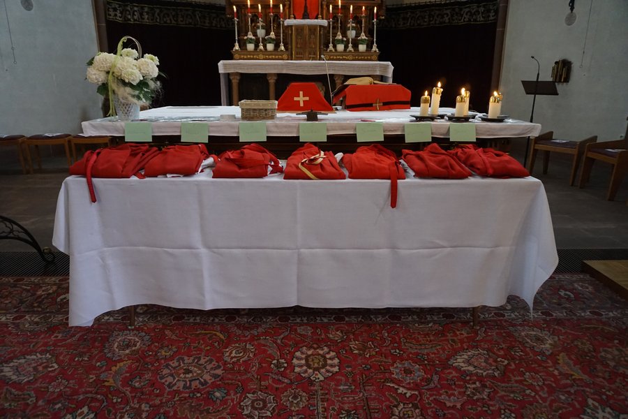 Leider waren zwei der neuen Messdiener*innen krank. Aber für das eine Kind hat die Oma alles entgegengenommen und für das andere Kind die ältere Schwester, die auch Messdienerin ist.