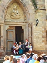 Der Gemeindeausschuss hat für das Konzert, das im Freien vor dem Hauptportal der Kirche stattfand [und der liebe Gott hat uns ein wunderbares Wetter geschenkt], Tische und Bänke, Getränke und Brezeln besorgt.